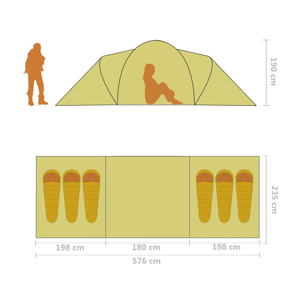 تتميز بتصميم داخلي مريح ومناسب للتخييم في الهواء الطلق، والسفر، ولقضاء إجازة في موقع التخييم. هذه الخيمة كبيرة بشكل يتسع لـ 6 أشخاص. تحتوي على حجرتين مختلفتين، كل واحدة منها توفر مساحة واسعة لاستيعاب 3 أشخاص كحد أقصى. يسهل نصب الخيمة ولا يستغرق تفكيكها سوى بضع دقائق للتخزين. يوجد زوج من القضبان المرفقة لإنشاء مظلة للمدخل. مادة الجدار الداخلي مسامية. تحتوي الأرضية على فيلم مصنوع من مادة البولي إيثيلين. للحصول على خيمة مانعة لتسرب الماء بنسبة 100٪، ننصح برش الخيمة برذاذ مقاوم للماء. كما تحتوي على ناموسية في كابينة النوم لقضاء ليالي الصيف دون الانزعاج من الحشرات. حقيبة الحمل المرفقة تضمن سهولة النقل.