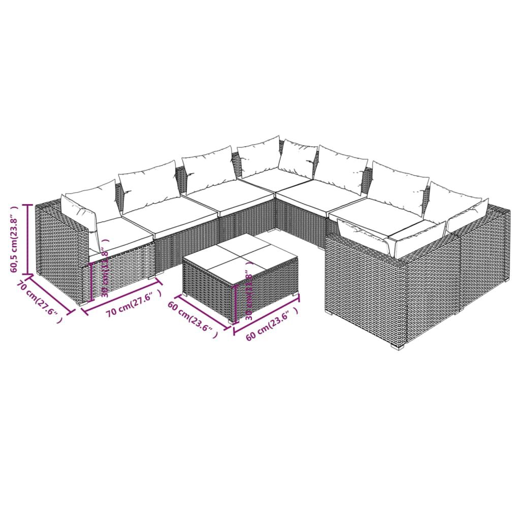 vidaXL عدد 9 قطع طقم جلسة حديقة مع وسائد بولي روطان رمادي
