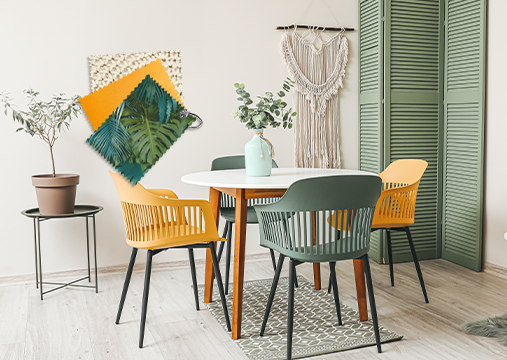 حوّل غرفة الطعام الخاصة بك إلى تحفة فنية على الطراز الصاخب. اختر ورق الحائط الزاهي، وأغطية الطاولات المتنوعة، ولمسات جذابة لتصميم تجربة طعام فريدة.