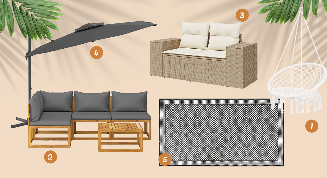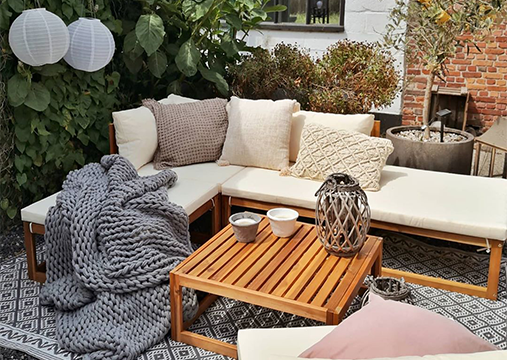 لتتمايل حديقتك بين الألوان والبريق وشعور السلام. اكتشف سجادنا الزاهي ووسائدنا النسيجية ومصابيحنا البراقة!